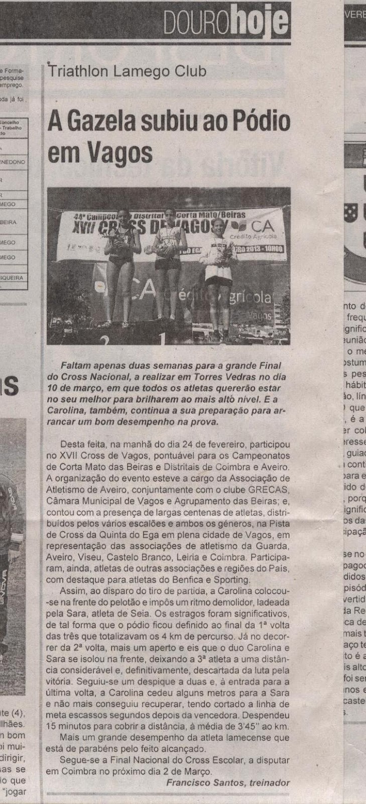 Os Semanários VOZ DE LAMEGO, JORNAL DO DOURO, DOURO HOJE e NOTÍCIAS DO DOURO publicaram, na semana de 25fev13 a 03mar13, um artigo sobre o Cross da Beiras realizado em Vagos.